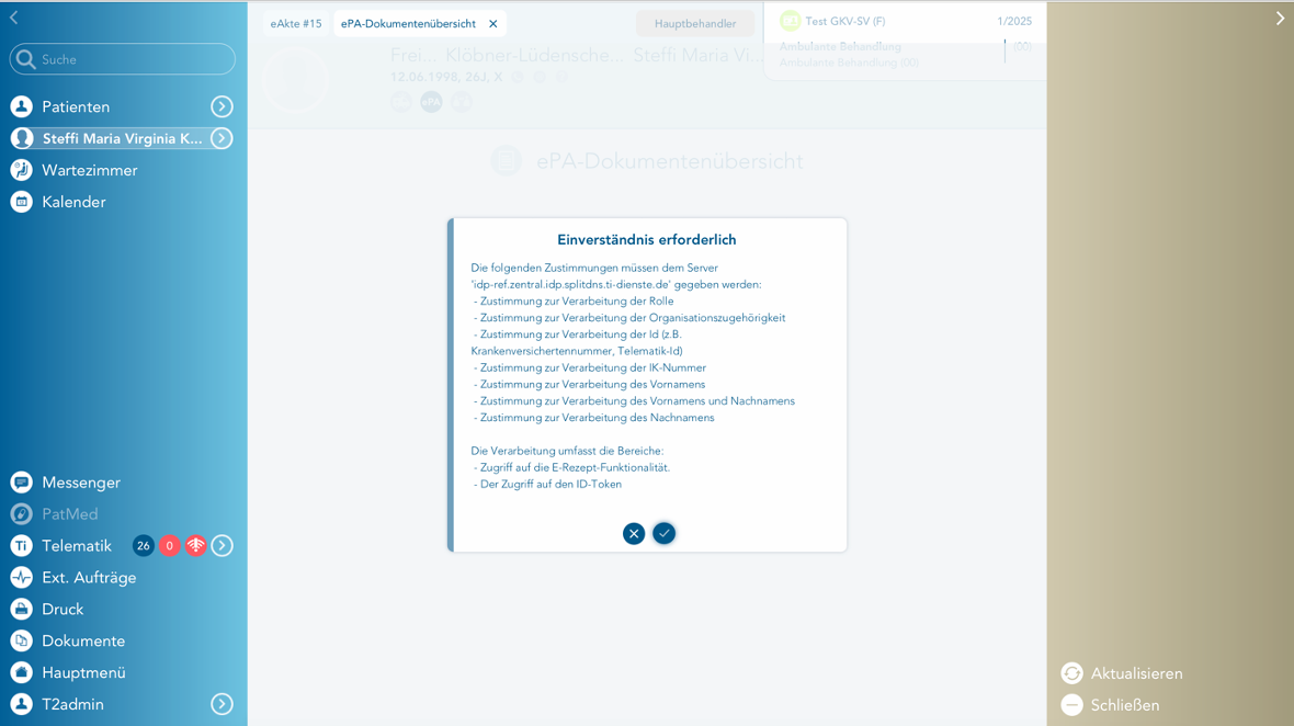 Sollte keine Berechtigung zur Nutzung der ePA vorliegen, so werden Sie an dieser Stelle darauf hingewiesen. Für jede weitere Nutzung der ePA innerhalb des Berechtigungszeitraums, der vom Patienten festgelegt wird (Standard: 90 Tage), muss die Versichertenkarte nicht mehr gesteckt werden. Hat der Patient eine Berechtigung erteilt, muss einmalig im System das Einverständnis für die Nutzung der ePA seitens der Arztpraxis gegeben werden.