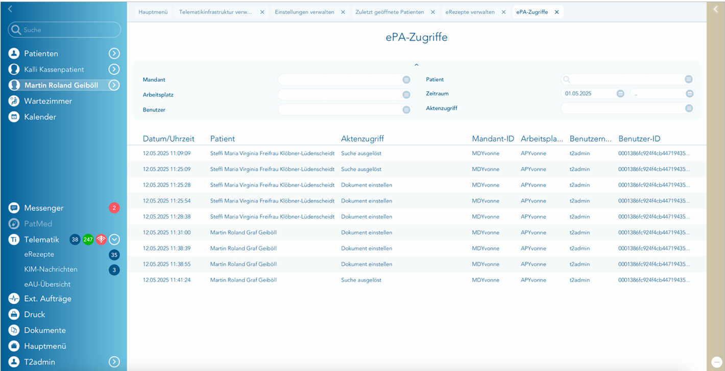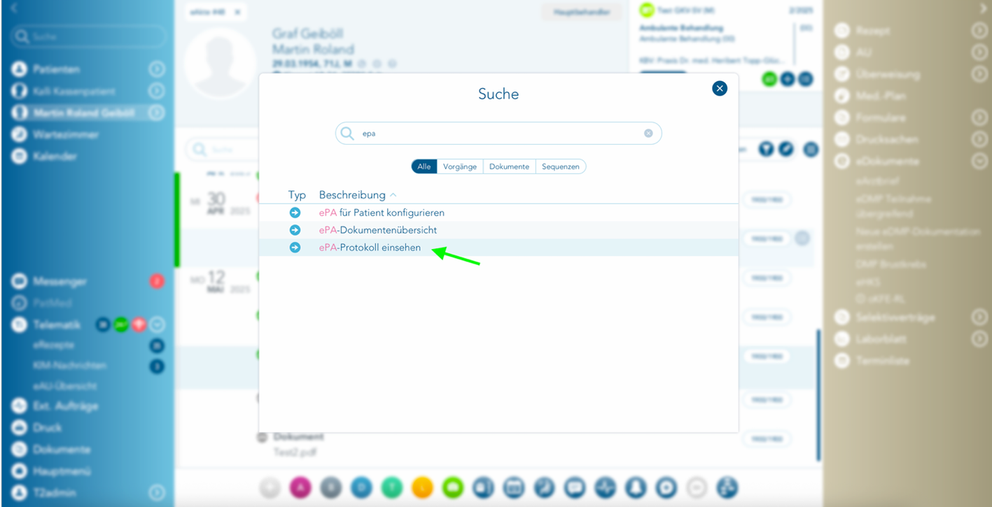 Über die Suche finden Sie den Zugang zum ePA-Protokoll, in dem alle ePA-Zugriffe dokumentiert werden. Sie können nach Nutzer, Mandant, Arbeitsplatz, Zeitraum oder Patient filtern und sich einzelne Aktenzugriffe anschauen.