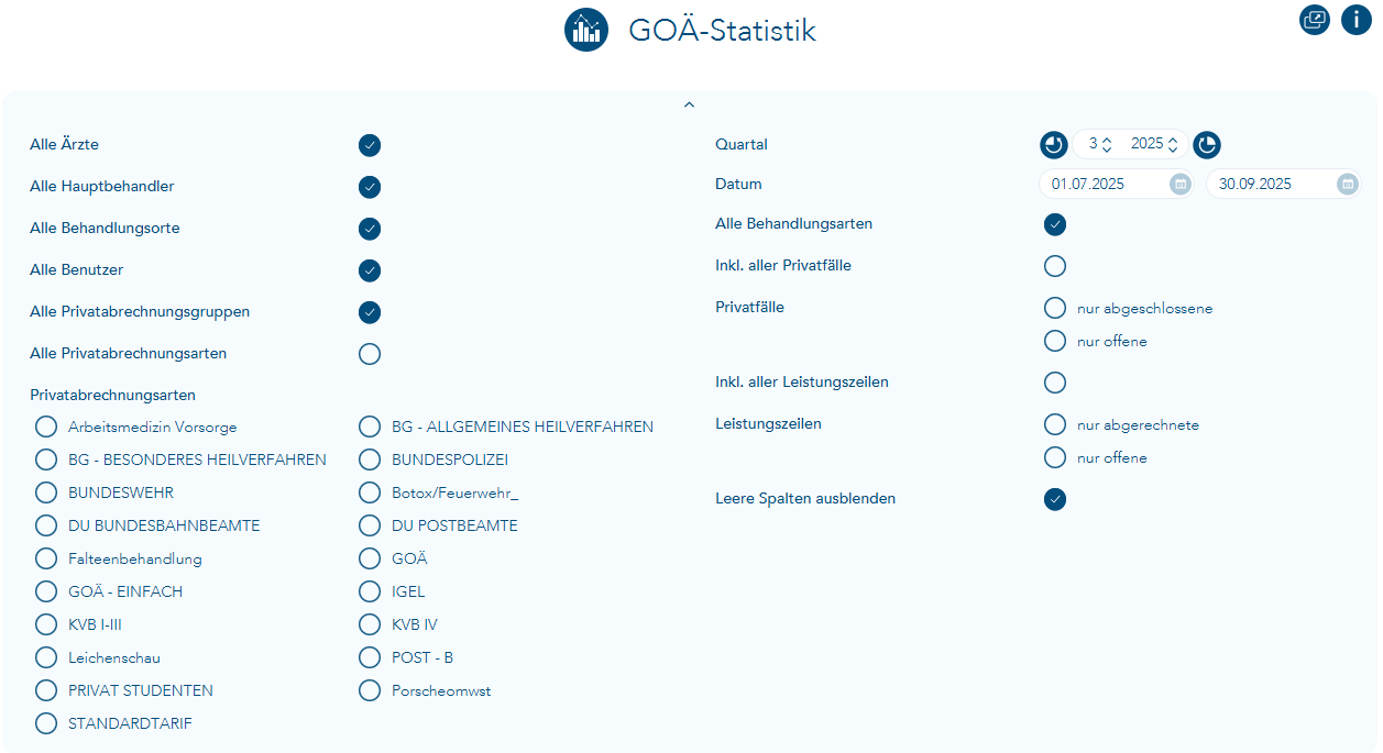 Neben der Arztauswahl, Hauptbehandler, Behandlungsortauswahl und Privatabrechnungsgruppenauswahl können Sie weitere Filteroptionen zu den Privatabrechnungsarten, den Fällen und den Leistungszeilen vornehmen.