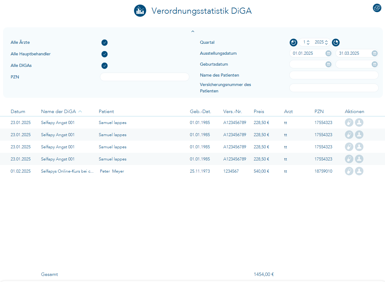 - Aktionen: Symbole für mögliche Aktionen (Aufruf der Verordnung oder Aufruf des Patienten).