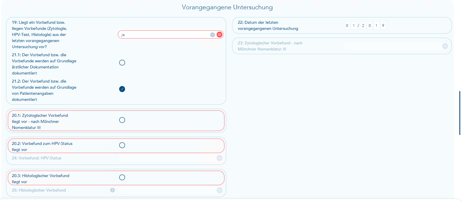 Am Beispiel der PB-Dokumentation ZKP im Eingabebereich "Vorangegangene Untersuchung" ist das Programmverhalten bei den Eingabefeldern 16, 17, 18, 19 und 27 nun so, dass diese miteinander "verknüpft" sind. Wenn Sie im Eingabefeld 16 beispielsweise "Ja" eingeben, öffnen sich weitere erforderliche Felder, wie in diesem Fall das Eingabefeld 30. Wenn Sie hier "Nein" eingeben, ist keine weitere Angabe erforderlich und die rote Umrandung verschwindet sofort.