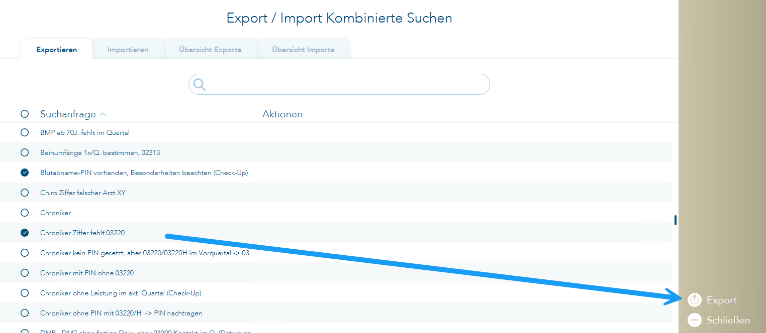 Im Reiter "Exortieren" wählen Sie die kombinierten Suchen aus, die Sie gern für Ihre KollegInnen bereitstellen möchten: