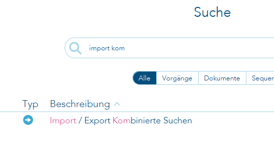 Wenn ein Benutzer mit dem entsprechenden Benutzerrecht im "Hauptmenü" auf "Eigene Listen" klickt, dann befindet sich ganz unten der Menüpunkt "Import / Export Kombinierte Suchen" - ebenso, wenn Sie über Strg + Leertaste nach dem Vorgang suchen: