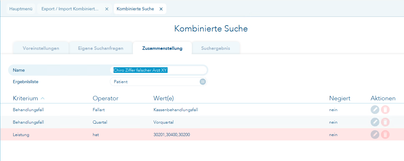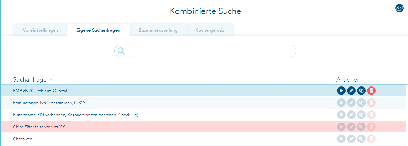 Wenn in der Suche bestimmte Arztrollen oder Behandlungsorte verwendet wurden, können und sollen diese beim Einlesen der Daten in einer "fremde" Praxis nicht übernommen werden. Aber Sie erkennen solche Einträge im Reiter "eigene Suchanfragen" an der roten Hinterlegung: