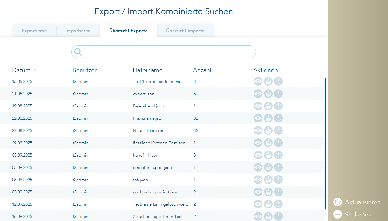Es gibt Praxen, die nutzen bereits sehr intensiv die kombinierten Suchen und haben sich sehr umfangreiche Suchen in T2med angelegt. Und dann gibt es Praxen, die sich noch nicht mit den Möglichkeiten der kombinierten Suchen befasst haben (wie zum Beispiel Neuanwender), die gern von den KollegInnen die ausgefeilten Suchmöglichkeiten übernehmen würden. Dafür gibt es nun die Möglichkeiten die kombinierten Suchen zu exportieren und zu importieren.