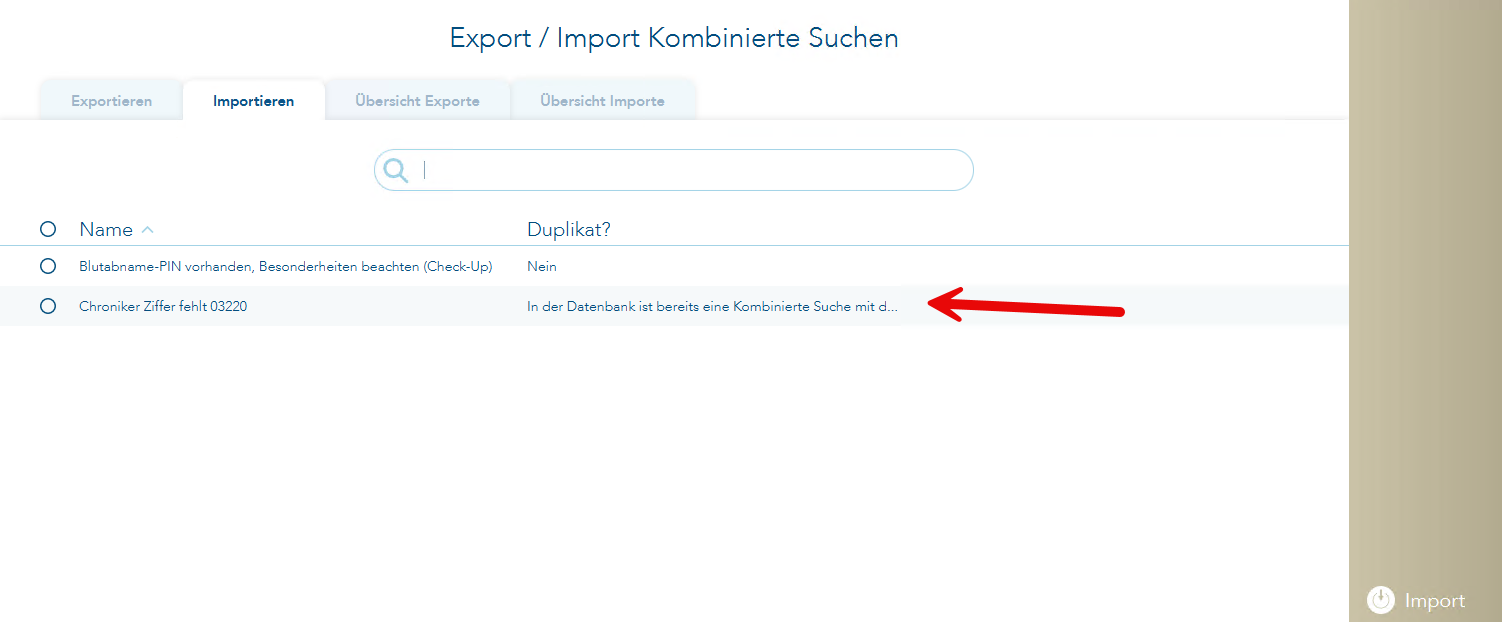 Nach dem Import stehen Sie automatisch in der kombinierten Suche und dort im Reiter "eigene Suchanfragen" und können mit der Bearbeitung der importierten Suchen beginnen (sofern erforderlich). Im Reiter "Übersicht Importe" sehen Sie sämtliche Importe, die Sie in Ihrer Praxis durchgeführt haben.