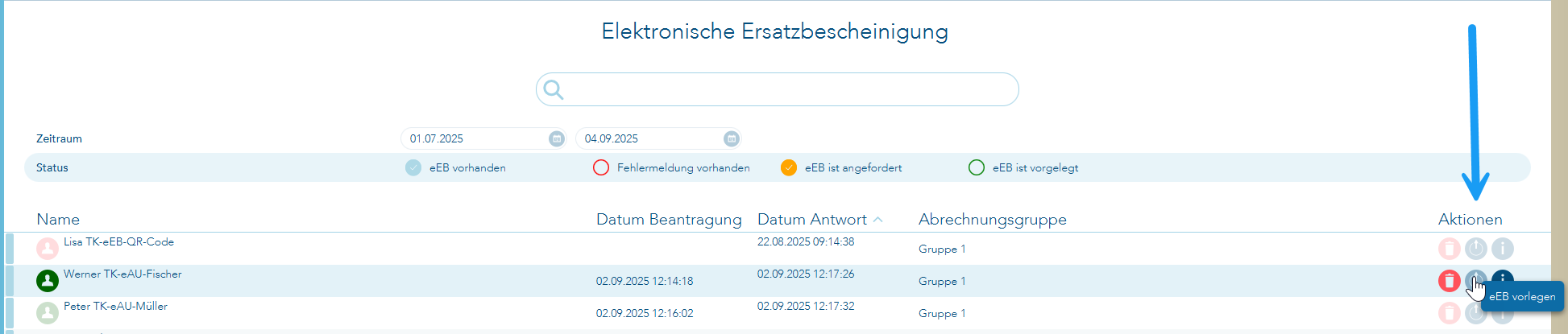 Sollen zum Beispiel nur die blauen Zeilen angezeigt werden, so können Sie per Shift + Mausklick auf das blaue Häkchen vor "eEB vorhanden" klicken und es werden Ihnen nur noch die eEB-Zeilen angezeigt, wo Sie die Vorlage durchführen können.
