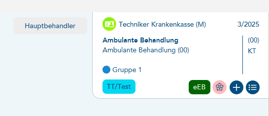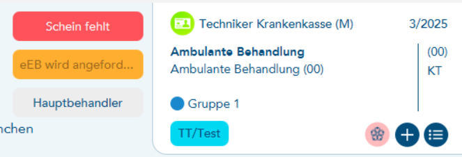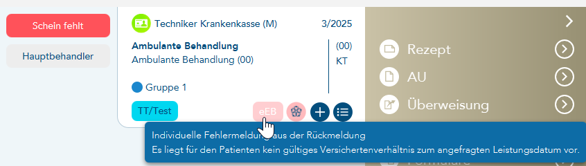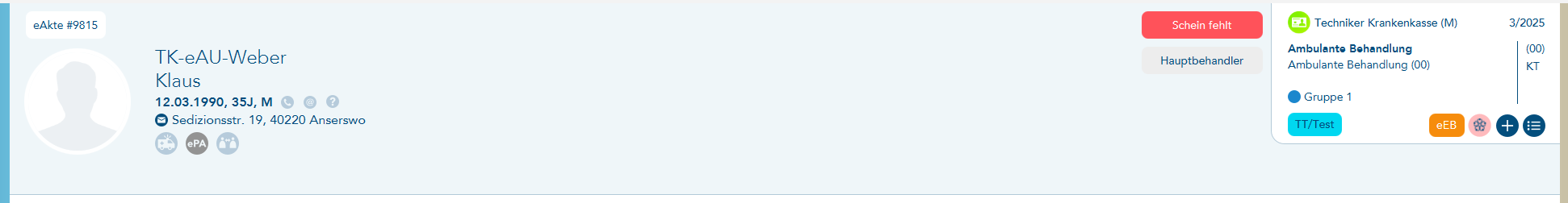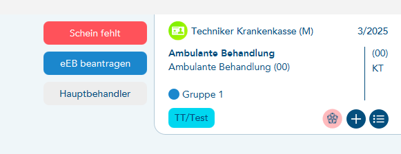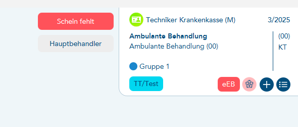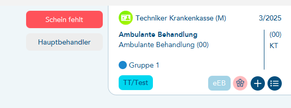 Sofern bei einem Patienten noch keine eGK zum aktuellen Behandlungsfall vorgelegt wurde und noch "Schein fehlt" im Patientenkopf steht, befindet sich nun zusätzlich ein Button "eEB beantragen" unterhalb des Buttons "Schein fehlt".