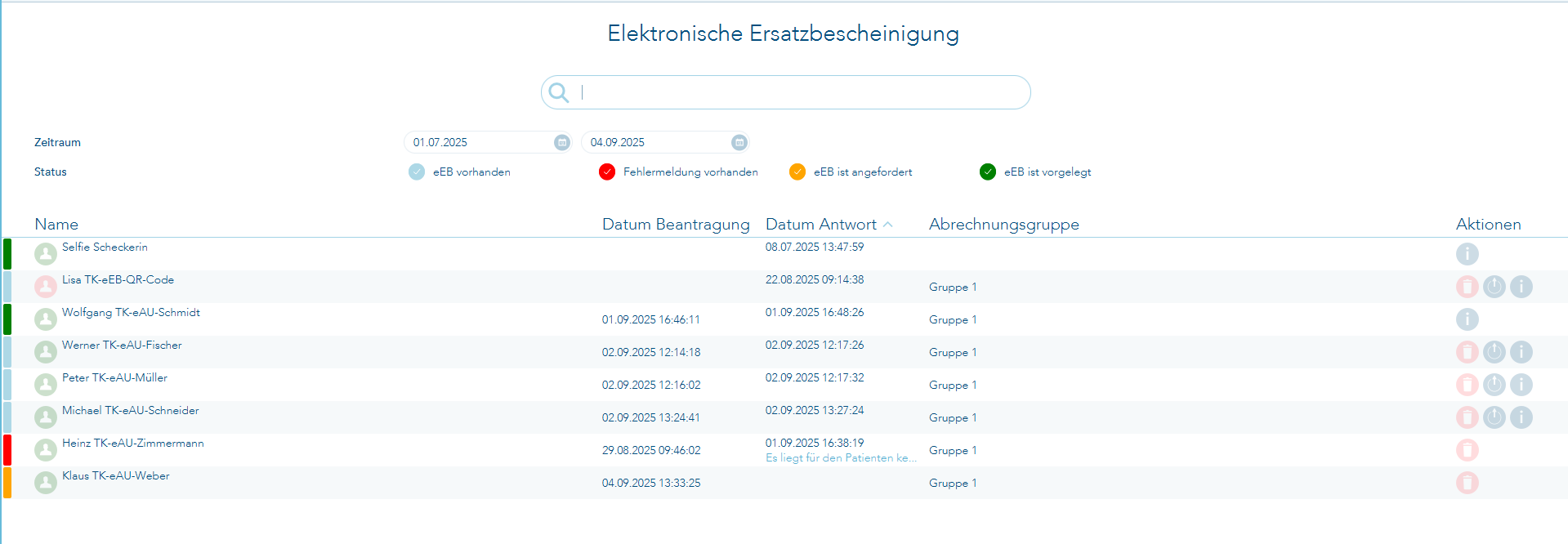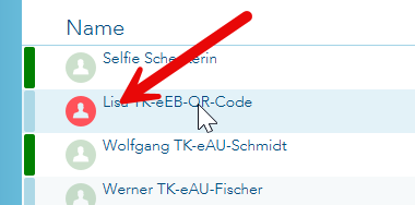 Neben den farblichen Kennzeichnungen zum Status der eEB-Anfragen sehen Sie zusätzlich den Patientenkopf-Button, welcher die Patientensitzung öffnet. Ist der Button in rot dargestellt, so handelt es sich um eine eEB, welche vom Patienten angefordert wurde (über die Patienten-App und nicht durch die Praxis). Dann ist der Patient bei der Vorlage der eEB noch auszuwählen - das kann nicht automatisch geschehen.