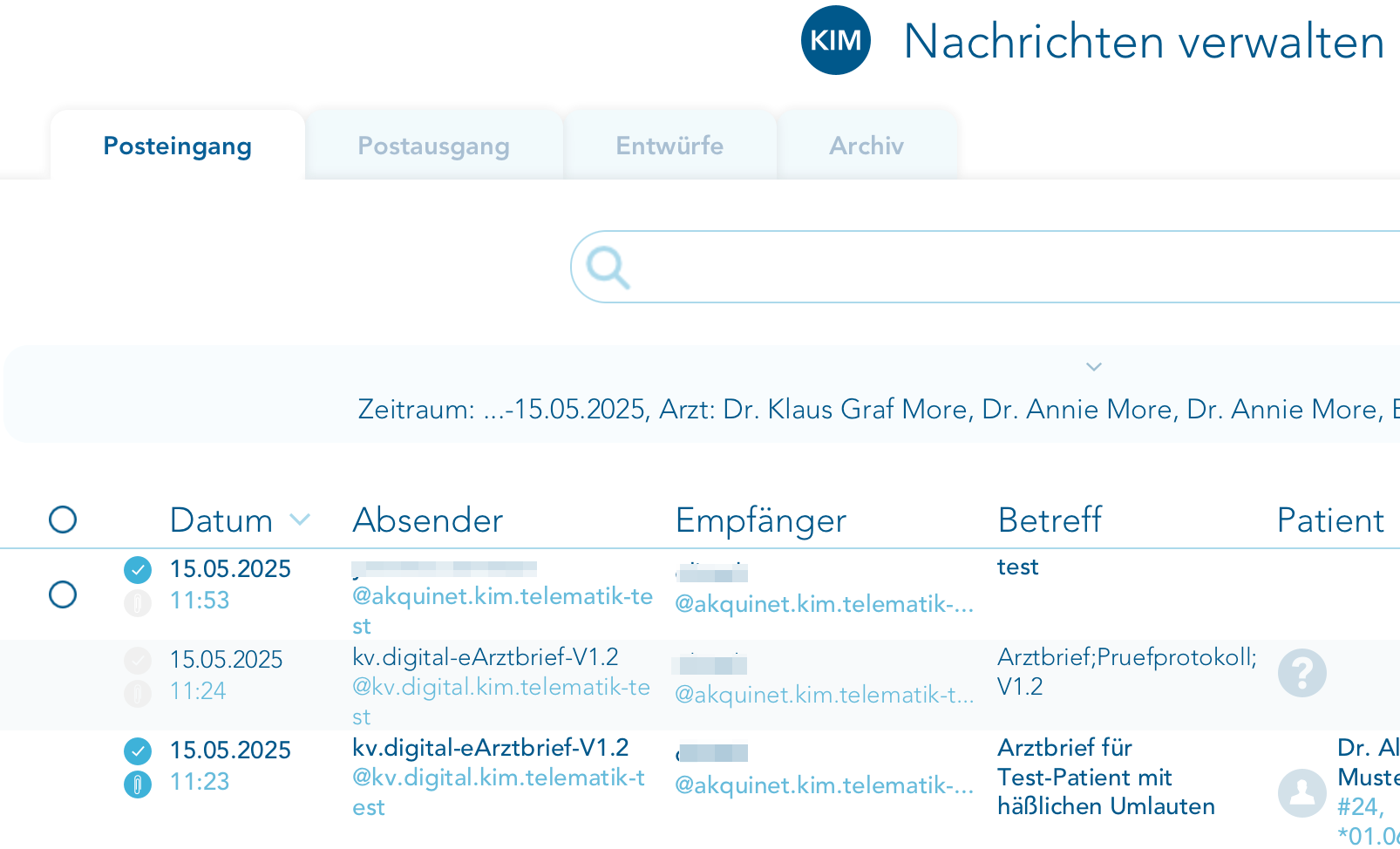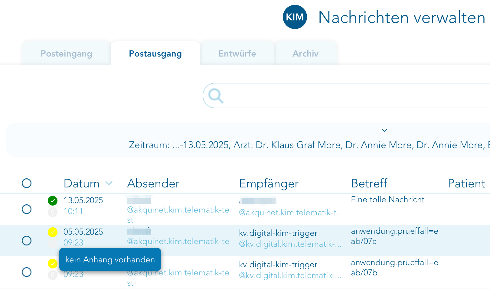 Im Vorgang "KIM-Nachrichten verwalten" existiert unter allen Reitern eine zusätzliche Spalte vor der Spalte Datum. In dieser Spalte werden zwei Symbole angezeigt, die den MDN-Status (Empfangsbestätigung) zu einer Nachricht angeben und ob ein Anhang an der Nachricht hängt, hier am Beispiel "Posteingang":
