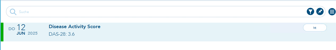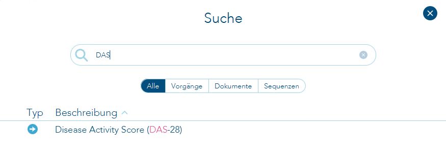 In der vorliegenden Version wurde der neue zertifizierte eDMP "Rheumatoide Arthritis" integriert. Ab sofort können Teilnahmeerklärungen, DAS-Score-Formulare und Dokumentationen erfasst werden. Darüber hinaus können die Dokumentationen exportiert werden. Es ist von essentieller Wichtigkeit, dass das "DAS-Score-Formular" vor dem Aufrufen der eDMP-RA-Dokumentationen ausgefüllt wird. Öffnen Sie das "DAS-Score-Formular" über die Suchfunktion, indem Sie die Tastenkombination Strg und die Leertaste drücken und anschließend "DAS" eingeben und auswählen.