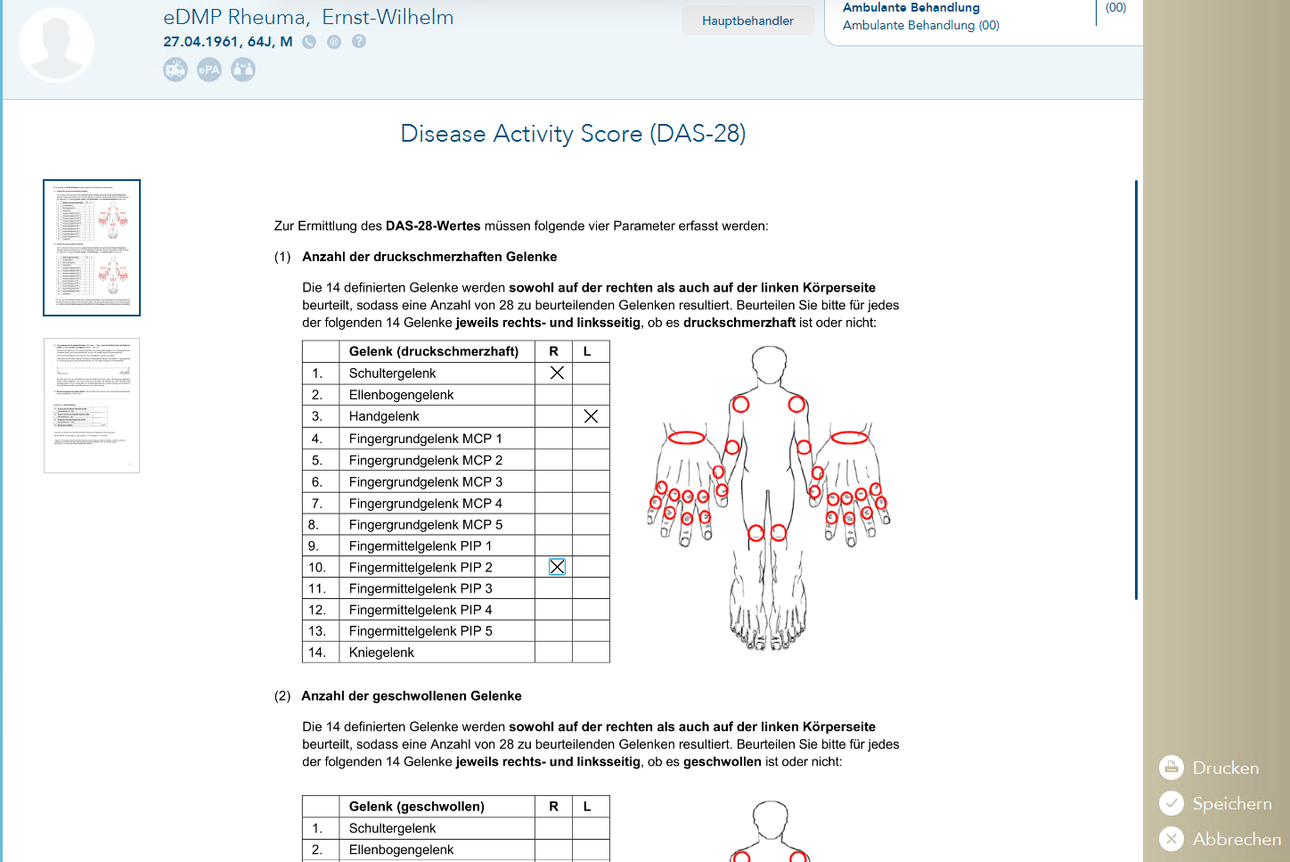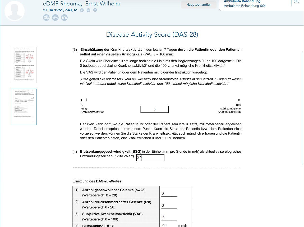 Füllen Sie das 2-seitige Formular aus, der DAS-Score berechnet sich automatisch.