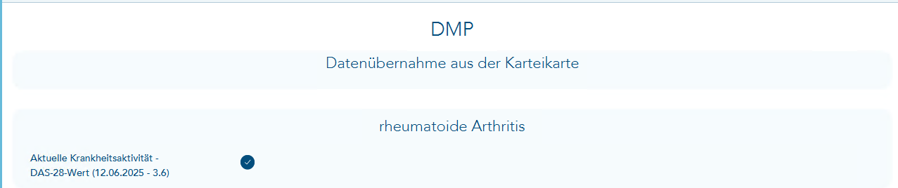 Anschließend kann eine Erst- oder Verlaufsdokumentation des eDMP RA geöffnet werden. In diesem Fall wird der entsprechende Wert aus der Patientenakte zur Übernahme in die Dokumentation angezeigt.