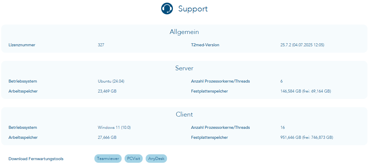 Um bei der Kontaktaufnahme mit dem T2med-Support alle wichtigen Informationen griffbereit zu haben, kann über das "Hauptmenü" der Menüpunkt "Support" ausgewählt werden. So können im Supportfall schnell und einfach die wichtigsten Informationen (z. B. die Lizenznummer) eingesehen werden.